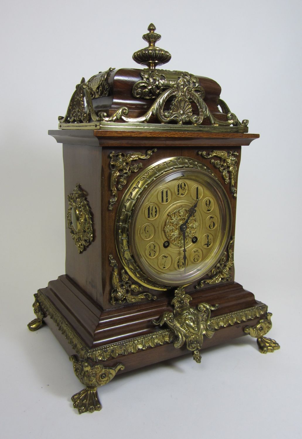 the circular brass dial with Arabic numerals below the moulded top and urn-like finial, the eight day movement striking on a gong, with a stepped base raised on four paw feet