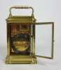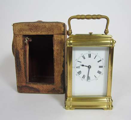 the white enamel dial with an eight day repeater movement striking on a gong, stamped with Drocourt trademark, in a brass gorge case, together with a leather travelling case