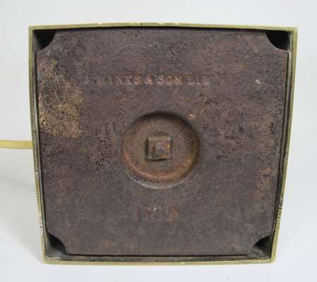 the redeed column with a Corithian capital, on a stepped square base, the cast iron to the base stamped 'J. Hinks & Son, 1782', converted to a lamp