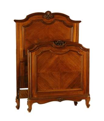the carved moulded cornice above a mirror door, flanked by panel doors enclosing drawers and hanging space, raised on moulded cabriole legs; together with a PAIR OF MATCHING SINGE BEDS (3)
