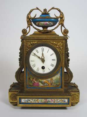 FRENCH GILT BRASS AND PORCELAIN MOUNTED MANTLE CLOCK