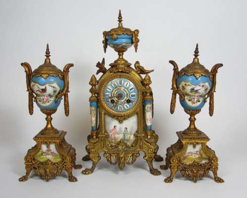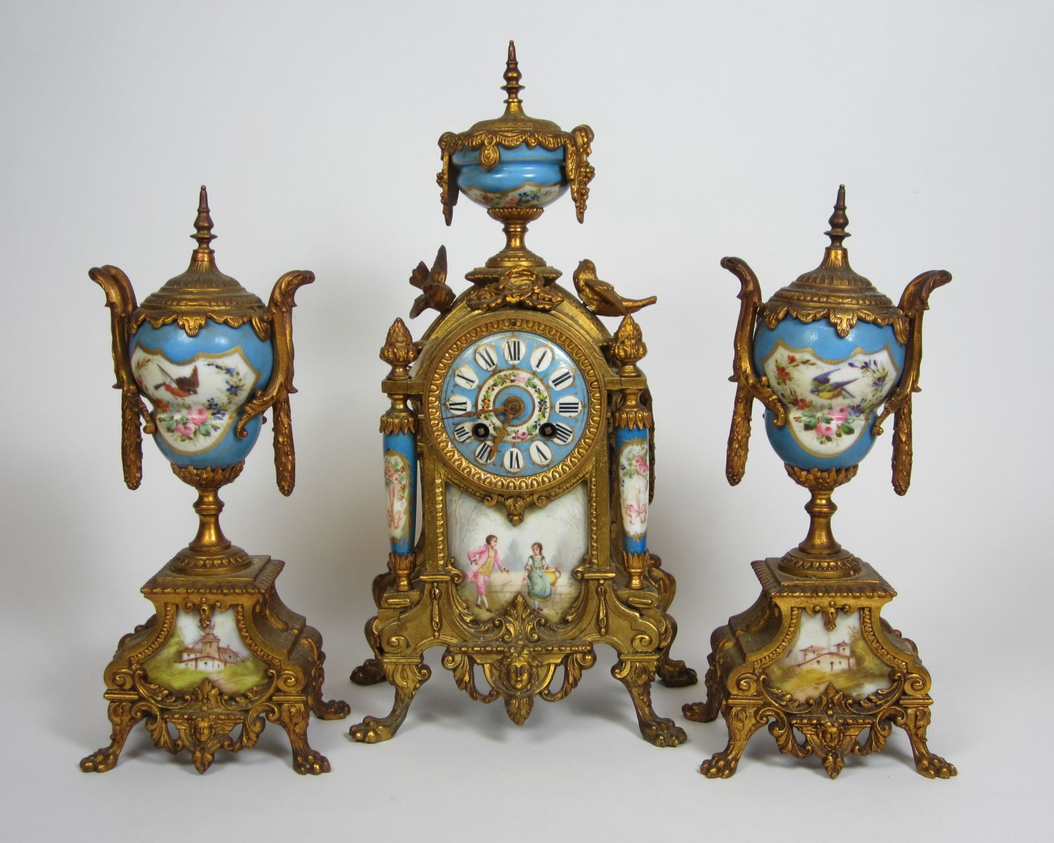FRENCH GILT METAL AND PORCELAIN MOUNTED CLOCK GARNITURE