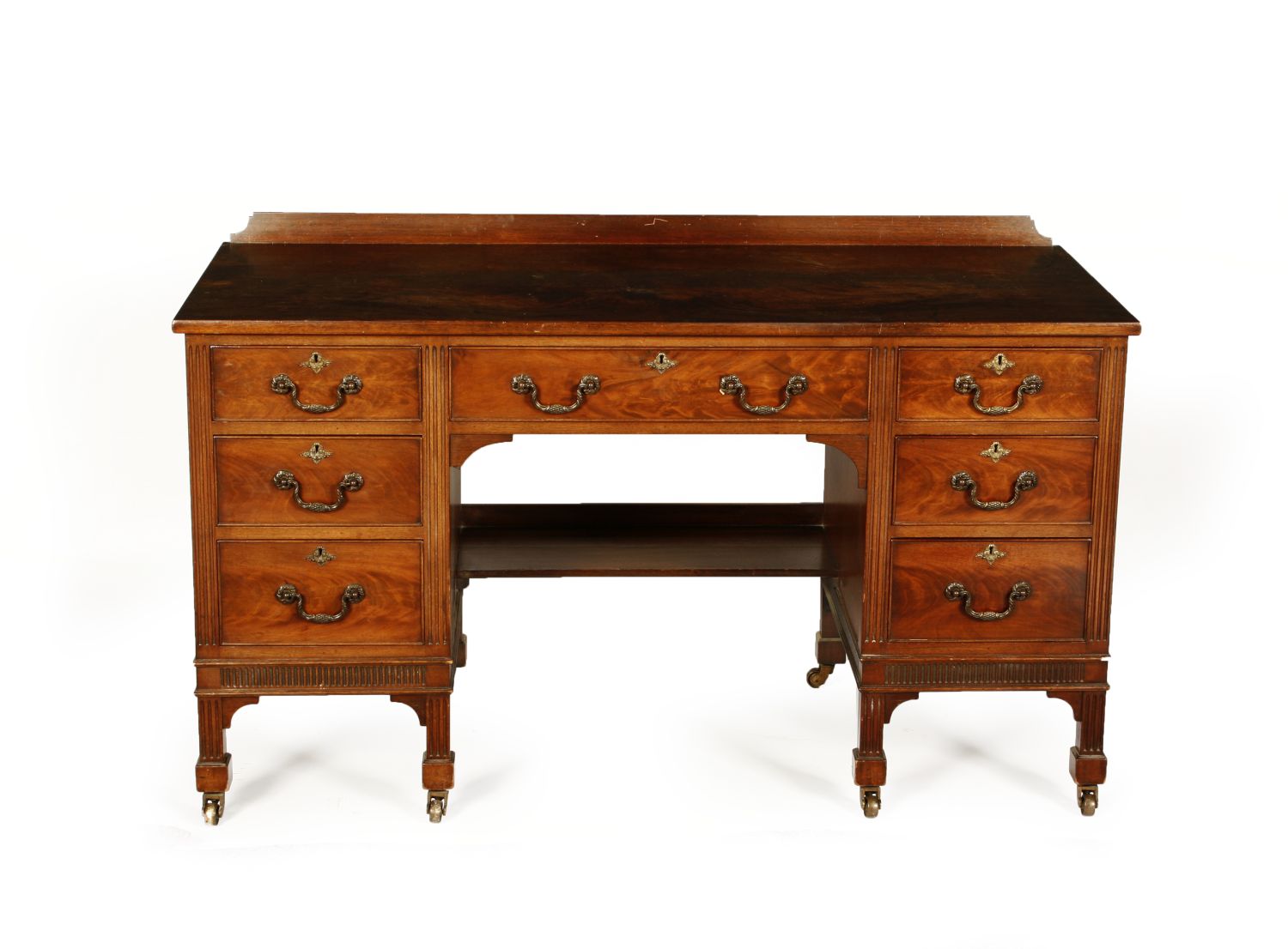 the galleried rectangular top above a single drawer, flanked on either side by three short drawers, raised on square legs and brass casters