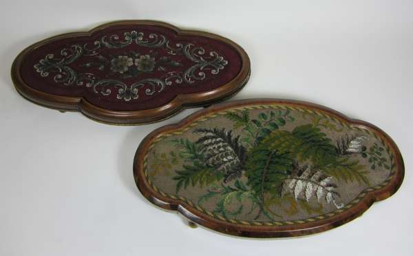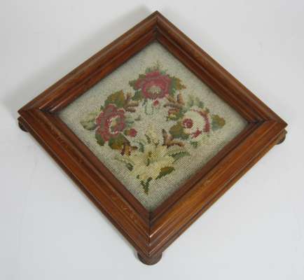comprising of: four large stands, a glazed framed plaque; and a further plaque, all depicting flowers and foliage, strung for wall hanging; and two stools; together with a WOOLWORK STOOL (9)