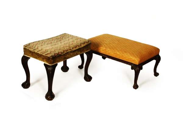 one with stuff over rectangular top above a gadrooned frieze, raised on carved cabriole legs and ball and claw feet, 84cm wide, 39cm high, 50cm deep; the second with upholstered cushioned top raised on acanthus carved cabriole legs and ball and claw feet, 68cm wide, 49cm high, 46cm deep (2)