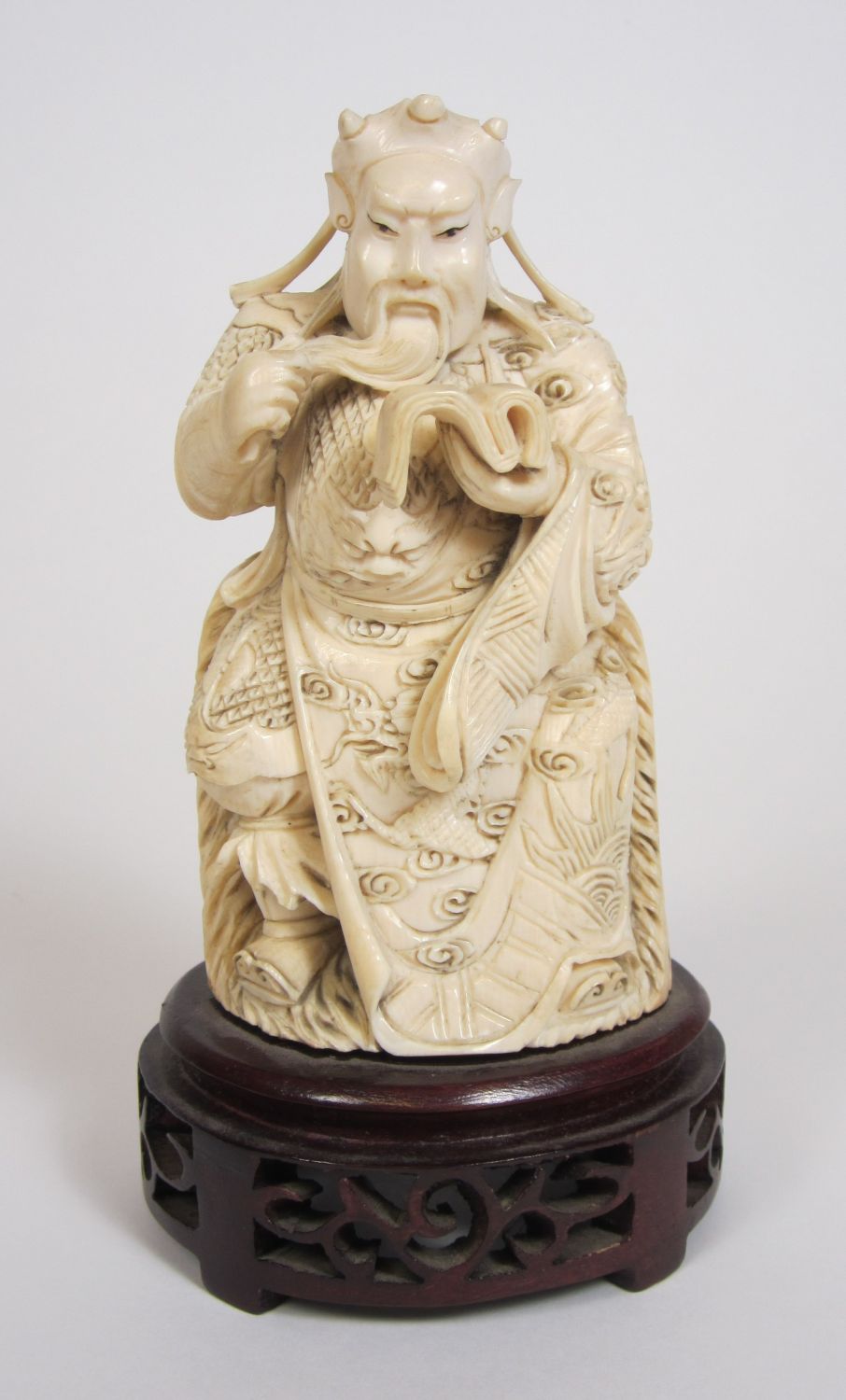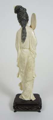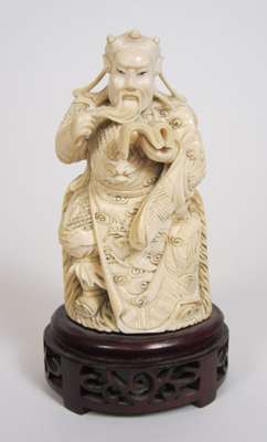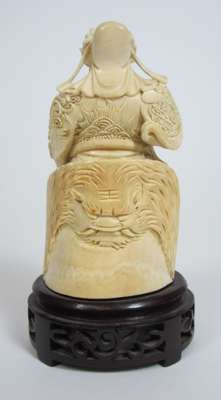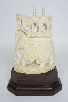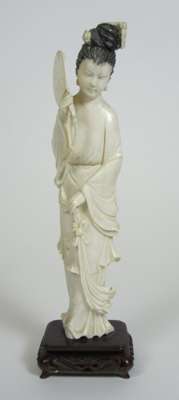 comprising: a Chinese figure of a seated immortal, on a carved hardwood base, 12.5cm high; a further Chinese figure, of a female with a fan, on a hardwood base, 23cm high; and an Indian figure of an elephant, with figures upon its back, on a hardwood base, 15cm high (3)