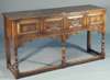 the rectangular top above three panelled drawers raised on baluster turned and blocked legs linked by stretchers,