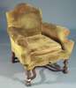 with serpentine back above turned and blocked legs with curved stretchers and scrolled feet