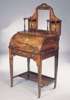 with neo-classical inlay, the shaped back centred by bevelled mirror flanked by open shelves above rectangular top and roll front enclosing fitted interior and drawer with writing slope, on square sectioned tapering legs united by undershelf