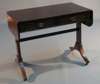the rectangular top with drop flaps above two frieze drawers, on rectangular tapering supports and downswept feet with brass hairy paw castors