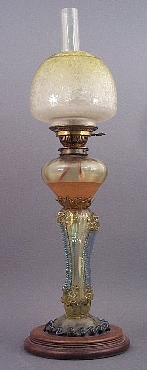 the tinted green shade enclosing a chimney above a reservoir, on a triangular column with lion heads and a later turned wood circular base