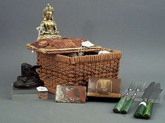 modelled as the winged lion of St. Mark, on oval base, 9.5cm wide; a brass seated Buddha, 16.5cm high; a square-cut section of red marble; a Mauchlineware box; a set of two knives and two forks, with green wooden handles; and a wicker sewing box, 20cm wide