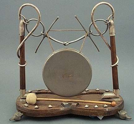 the oak frame formed as whips joined by a bridle on shaped base with fox's head feet and a striker