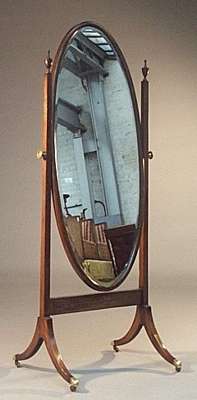 the oval mirror on square tapering and downswept feet, surmounted by urn finials