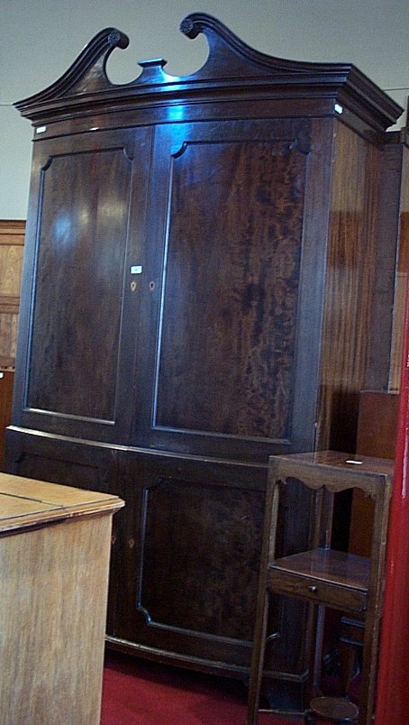 the swan neck pediment above a plain frieze, four panelled doors below, on splay bracket feet