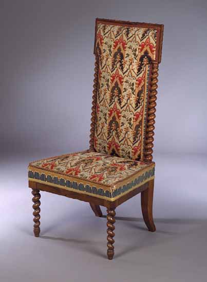 with Gothick needlework upholstery, the tall back framed by barleytwist columns, above spreading seat and corresponding tapering legs