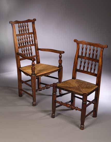 including two carvers, each with shaped top rail above two rows of turned spindles (three to the carvers), rush seat and turned front club legs joined by a similar stretcher (8)