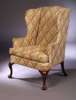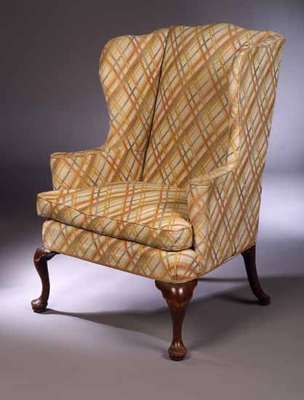 the upholstered shaped back, wings and outscrolled arms with squab seat above mahogany cabriole front legs with pad feet