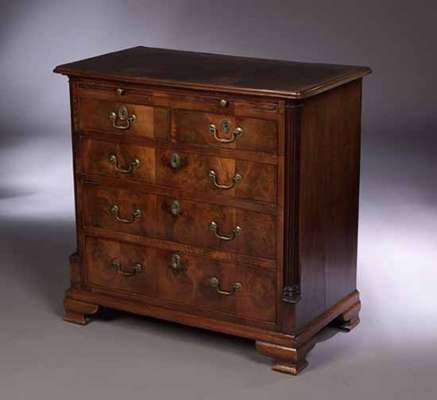 with flame veneers, the rectangular top with rounded angles and moulded edge above brushing slide and two short over three long graduated drawers flanked by quarter engaged fluted columns, on plinth with ogee feet