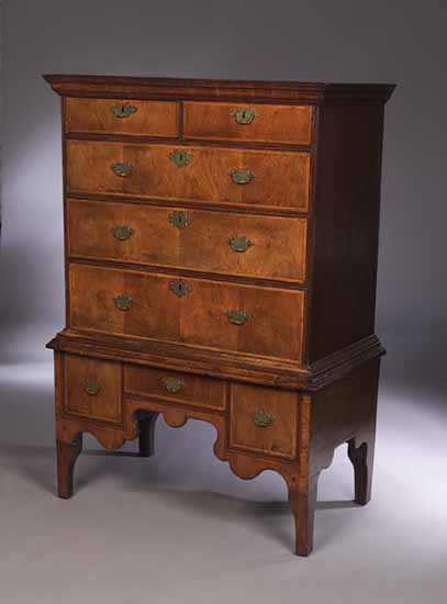 the moulded cornice above two short and three long feather banded drawers, on stand with three drawers arranged around shaped kneehole apron (later feet, restorations)