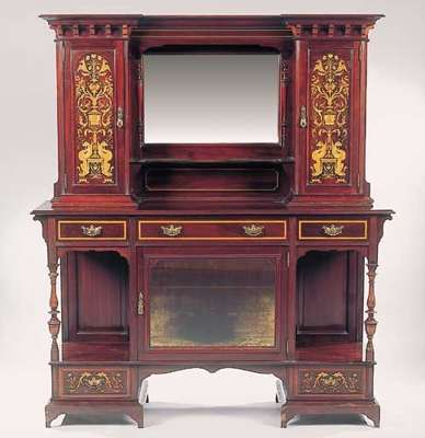 with satinwood banding, the consoled reverse breakfront cornice above central bevelled mirror flanked by cupboards with grotesque inlaid doors, raised on deeper base with three frieze drawers above central glazed door flanked by open shelves with inlaid drawers below, on bracket feet, stamped to drawer front