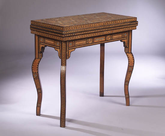 with mother of pearl inlay, the stepped rectangular foldover top enclosing velvet card surface further lifting to reveal chess board and backgammon board with sliding compartment enclosing counters, raised on square section cabriole legs