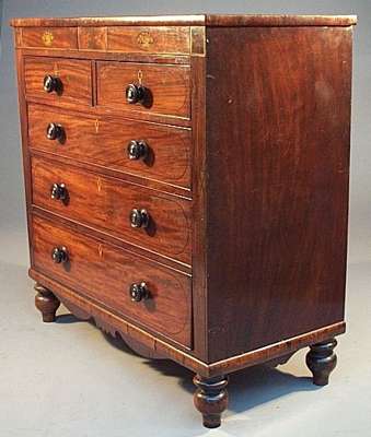 with two frieze drawers having oval inlaid panels above two short and three long graduated drawers, on later turned feet