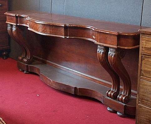 the shaped serpentine top above a plain frieze with three drawers raised on scroll carved double consoles, each with leafy terminals and scrolled toes raised on a shaped platform base with panelled back, the whole on flattened bun feet (wormed)