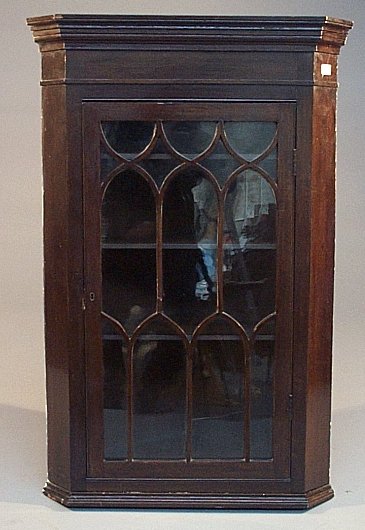 the moulded top above a plain frieze, a glazed door below enclosing two shelves above a moulded frieze