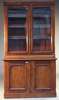 the moulded cornice above two glazed doors enclosing three shelves, the lower section with panelled doors on a plinth