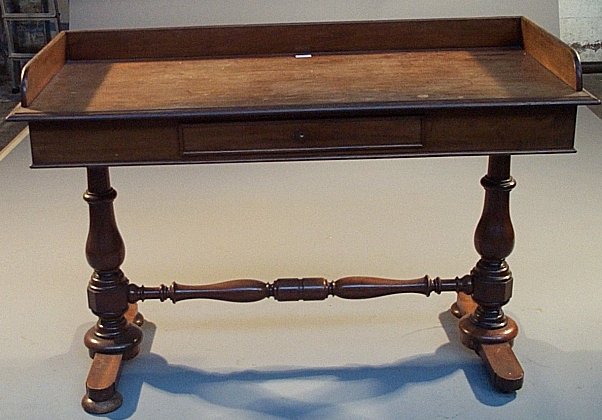 the oblong top with a three quarter gallery above a frieze drawer, on turned supports and bun feet, united by a turned stretcher
