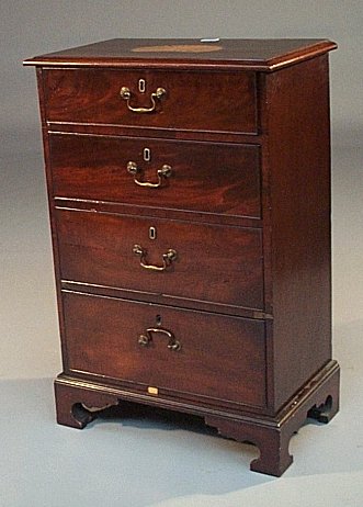 the oblong top with a moulded edge and a kidney inlaid panel, above four graduated drawers, on bracket feet