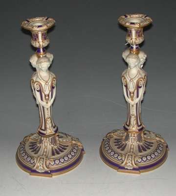 A pair of Mintons part glazed Parian Ware caryatid candlesticks