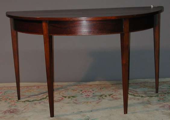 A pair of George III style mahogany demi-lune tables