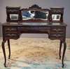the raised back fitted with three shpaed bevelled mirrors and two drawers, the top fitted with a stationery well above two drawers, on slender cabriole legs and peg feet with brass castors