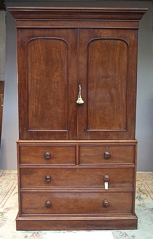 the moulded cornice above two arched panelled doors enclosing hanging space, the base with two short over two long drawers, on a plinth
