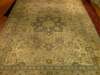 the cream field with central indigo lobed medallion suspending pendants, within similar palmette and vine border between stripes
