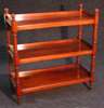 the three shelves with three quarter gallery joined by turned and block supports, on turned tapering legs with brass caps and castors,