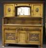 the upper stage with mirrored recess and cupboard to each side, the base with two drawers and two cupboards, carved floral and figural decoration