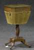 the rectangular top with reeded edge and canted corners, fitted interior, all on a qrythen column, platform base, reeded scrolling legs on brass caps castors