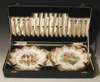 comprising eight fruit knives and forks and a set of eight blue and gilt border dessert plates by Hammersley, each with reserve panel of fruit