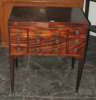 the rectangular twin flap top above a configuration of real and false drawers, opening to reveal a fitted interior on square cut tapering legs with brass cups and castors,