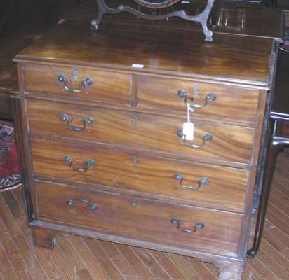 the moulded rectangular top above two short and three long drawers on bracket feet,