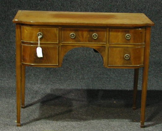 the bow fronted rectangular top with satinwood inlay and crossbanding above three short and two deeper drawers flanking the kneehole on square cut tapering legs and spade feet,