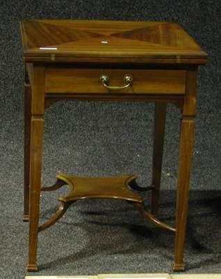 with frieze drawer on square cut tapering legs with step feet joined by shaped undershelf,