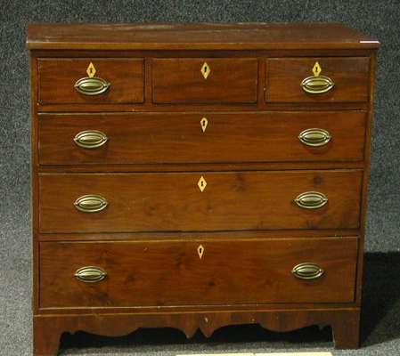 the rectangular top above two short over two long graduated drawers, on bracket feet with boxwood strung shaped apron,