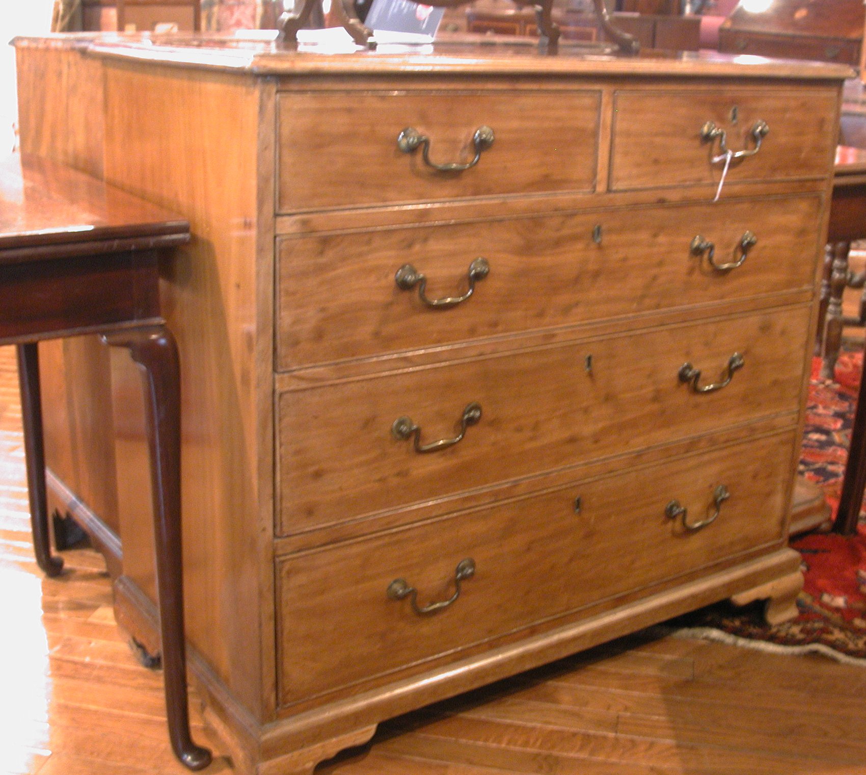 the moulded rectangular top above two short and three long graduated drawers, on ogee bracket feet