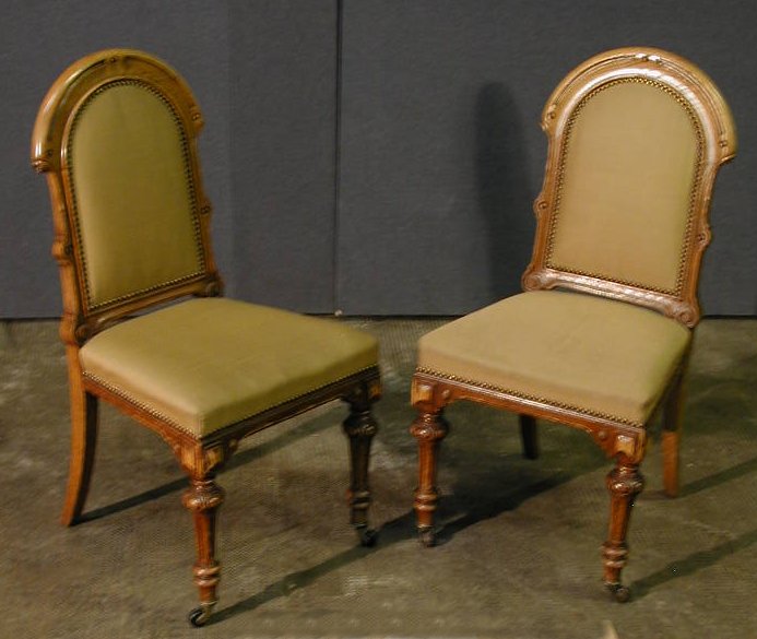 the shaped arched back with upholstered panel above stuffover seat on button turned and reeded legs and castors