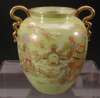 with twin handles decorated in the 'Pagoda Landscape' pattern, on a green ground, printed and painted marks, No. 4103, 25.5cm high, A Carlton Ware ovoid jug, decorated in the 'Hollyhocks' pattern, printed and painted marks, No. 3973, 19cm high, A Carlton Ware square serving dish, decorated with a paradise bird, printed and painted marks, No. 3916, 24cm across and a Carlton Ware circular bowl, decorated in the 'Hollyhocks' pattern, printed and painted marks, No. 3973,