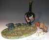 the thin tapering neck above baluster body decorated with chickens in circular foot, 24cm high, also an ivory netsuke, another wooden, an ivory figure group, and onyx desk stand decorated with brass elephants